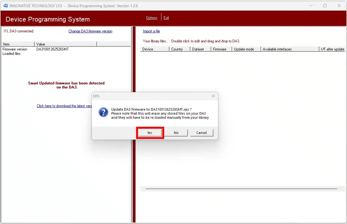 Select ‘Yes’ to Update the DA3 Firmware