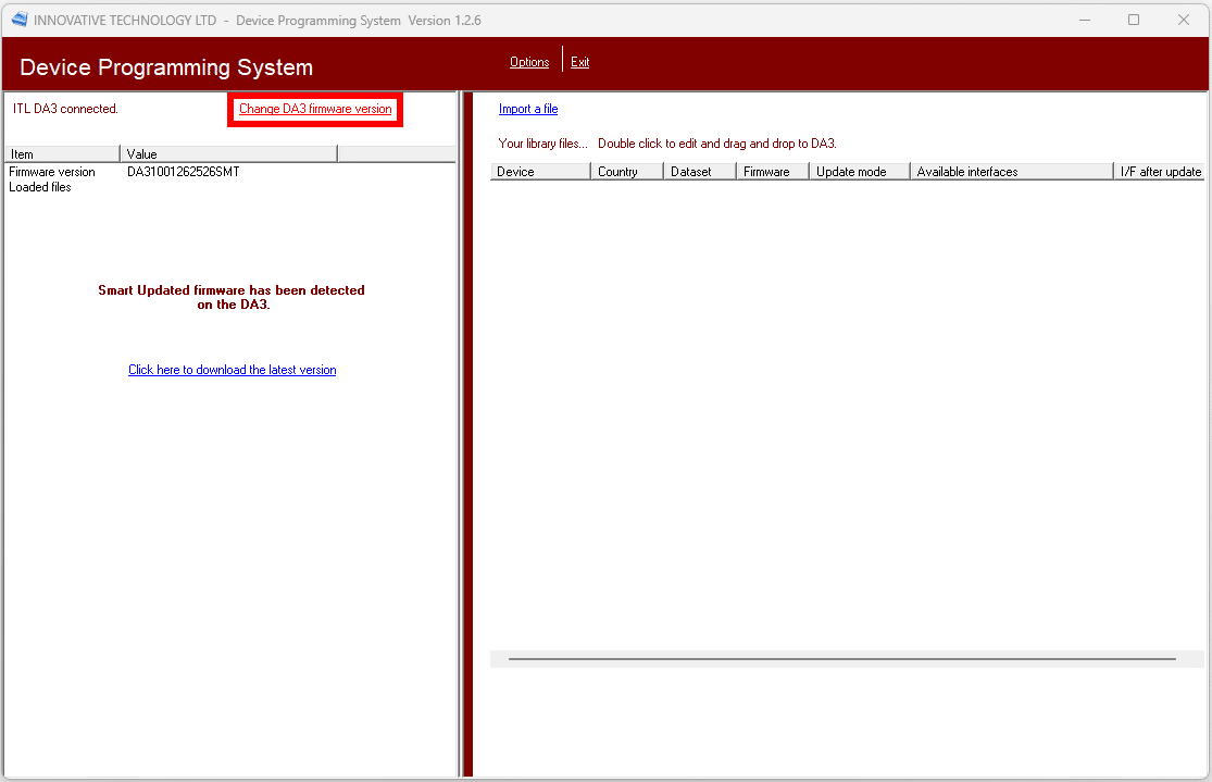 Select ‘Change DA3 Firmware version’ at the top of the screen.