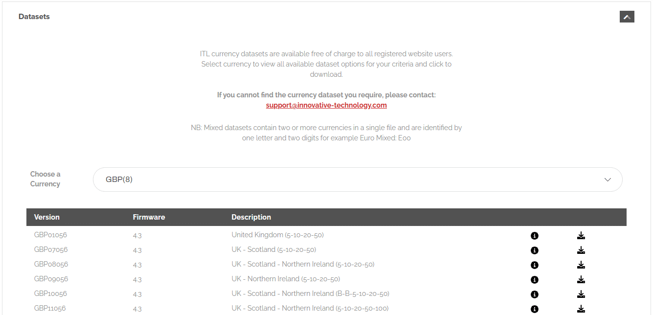 Further information is available by clicking the Information icon of each currency dataset line.