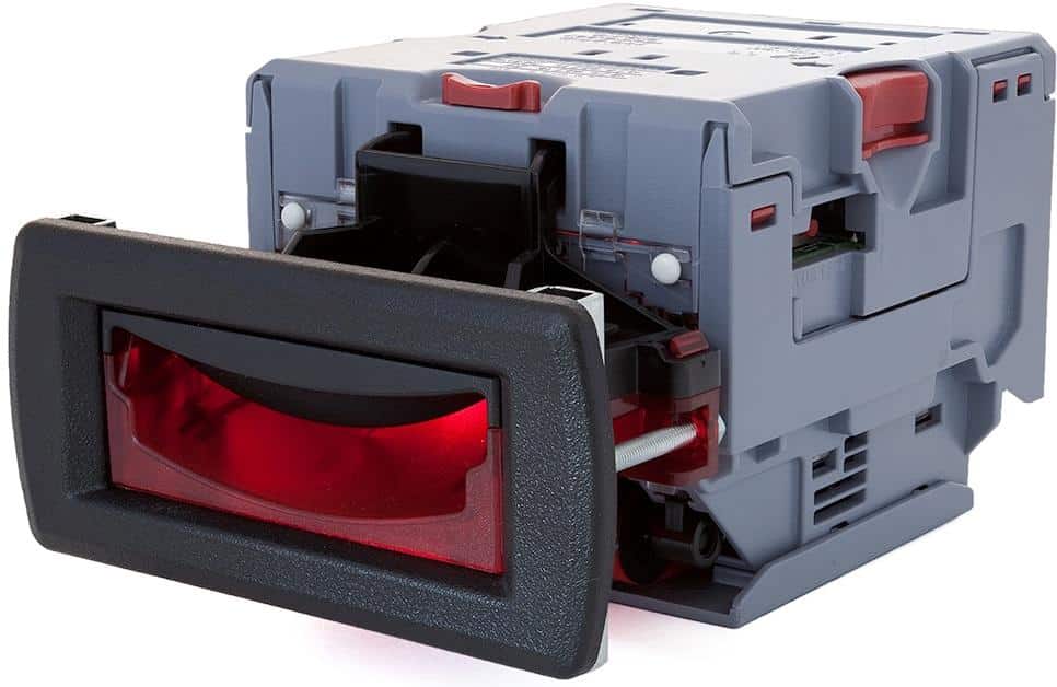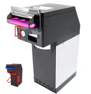 Insert the SD card with the UpdateV2.bin and updateST.nv2 into the card reader slot built into the front of the validator.